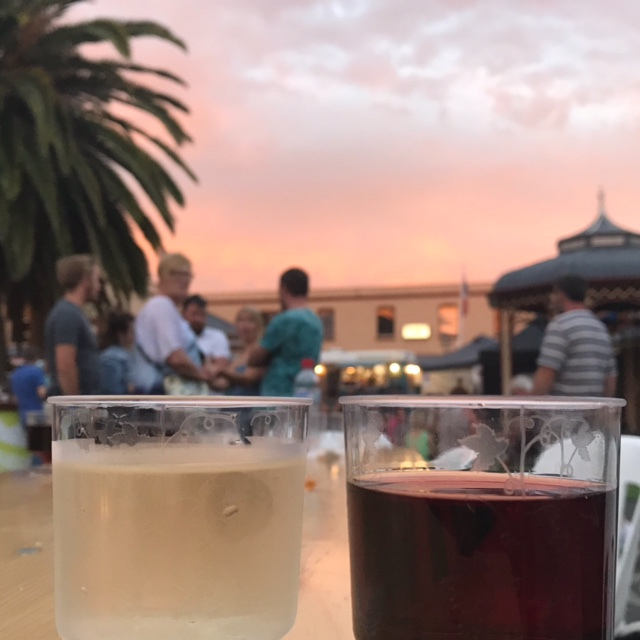 There was a huge palm tree in the centre of the square, surrounded by craft beer stalls, Goaty Hill wines and various food trucks selling everything from oysters to pulled pork burgers. We settled ourselves down with a few plastic glasses of wine and did some people watching until I looked up and saw the most remarkable sunset glowing above our heads.