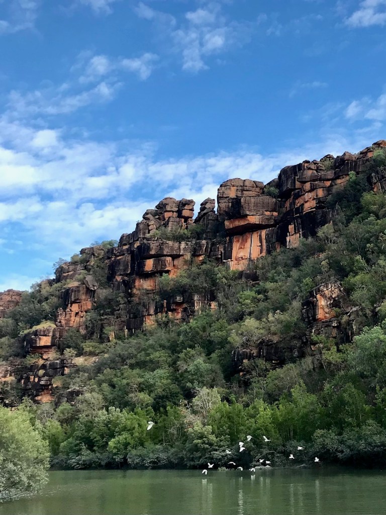 Flocks of corellas and brolgas swoop over our heads and we catch a glimpse of a pom-pom tailed short-eared rock wallaby. The air is blissfully cool and the scenery is stunning – soaring sandstone cliffs are all around us, their overhangs hiding indigenous art.