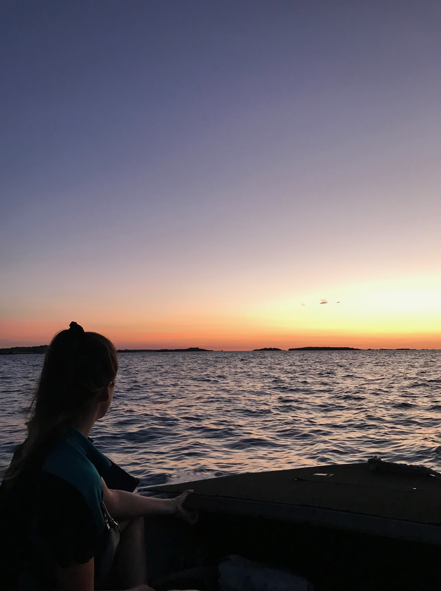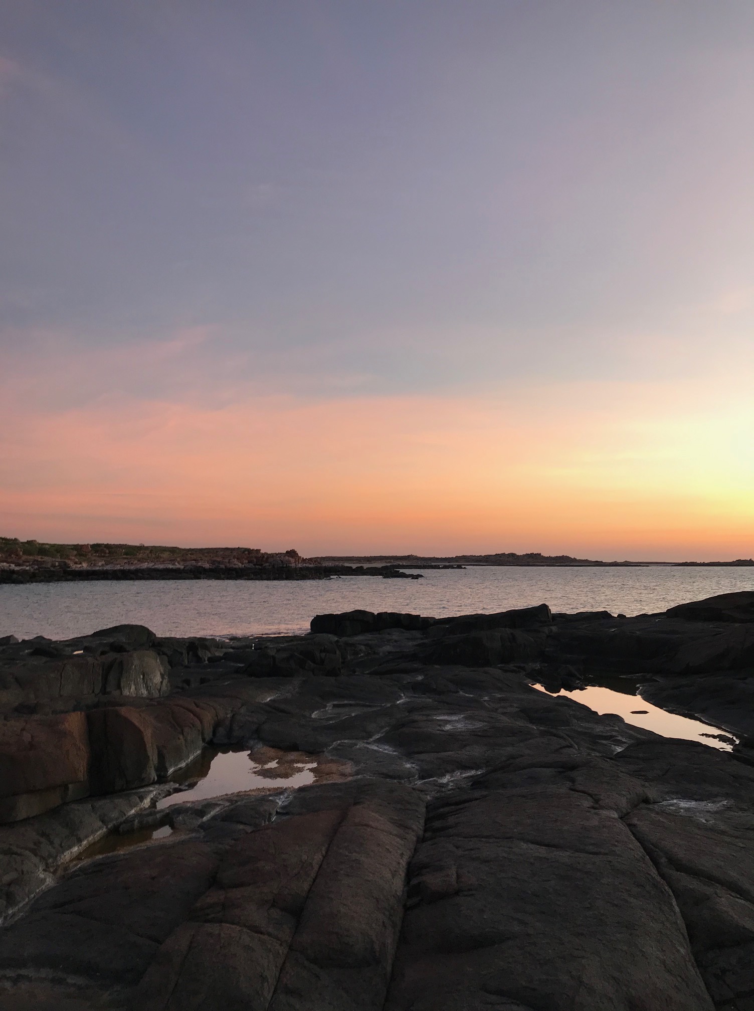 As we search for starfish and whales etched in the rocks, the sun begins to set beside us, flooding the sky with dramatic colour.
