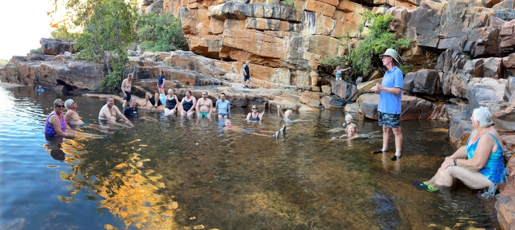 Larger cruise boats can’t get over the sandbar and send tenders up the river instead to the famed King George Falls. The Reef Prince is small enough to slip over and we cruise down the river, with dramatic ochre cliffs towering over us on each side.