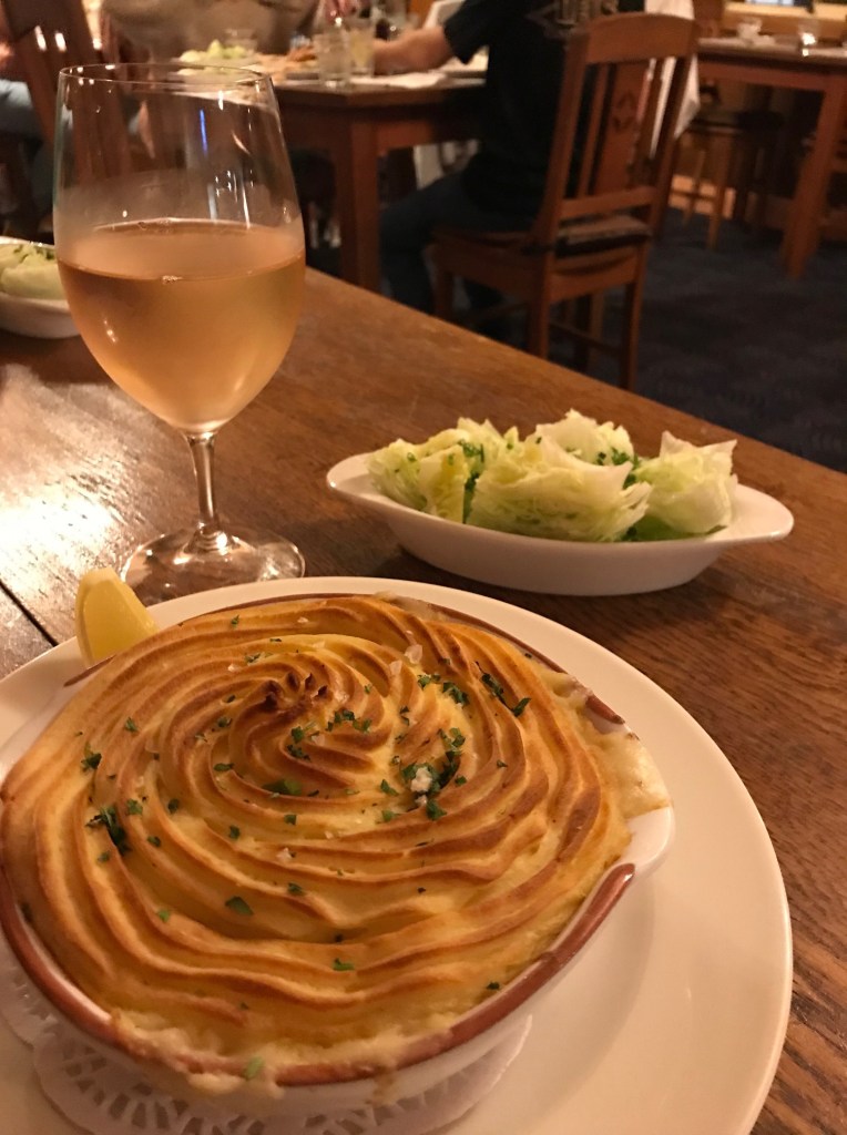 After checking in, we wandered across the road to the pub – aka Lynch’s Hotel – which was originally built in 1895, making it one of the oldest and most historic buildings in town. We ordered delicious fish pies and pink wine for our dinner.