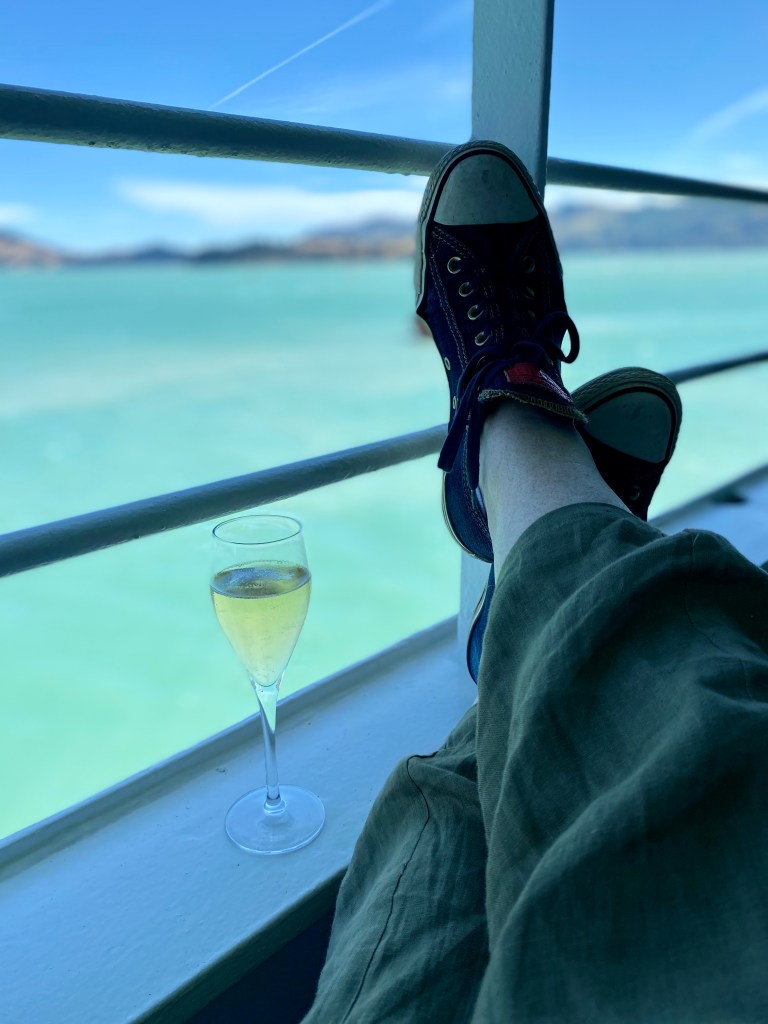 We lazed around in our cabin until it was time to wander out on deck for lunch, where I ordered my third steak with bernaise sauce for the voyage, teamed with frites, salad and Champagne as we watched the gorgeous New Zealand South Island’s coastline glide past.