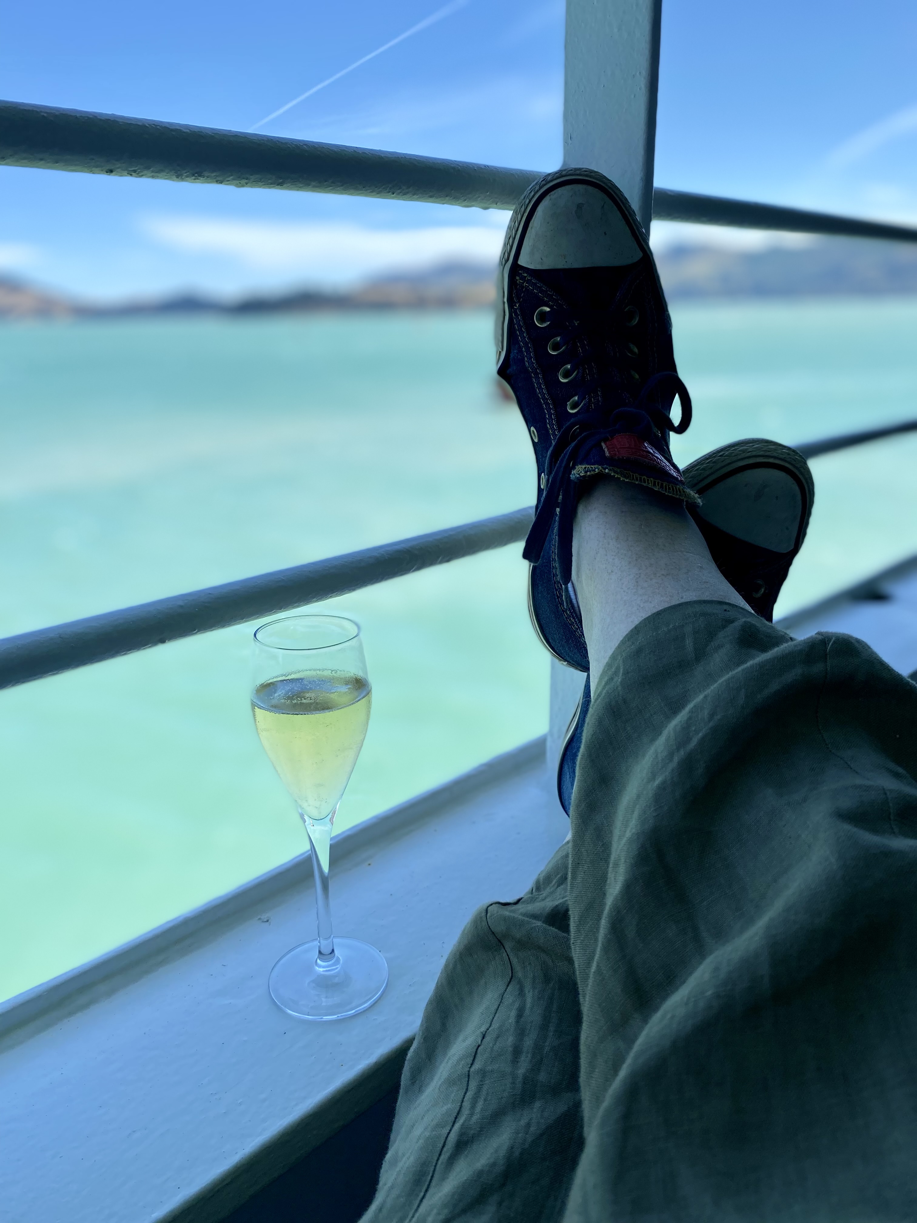 Back on board Le LaPerouse we spent a glorious hour on deck while the ship wended its way out of Dunedin Harbour as we sipped the Cocktail of the Day – white port with tonic water, rosemary and fresh orange slices.