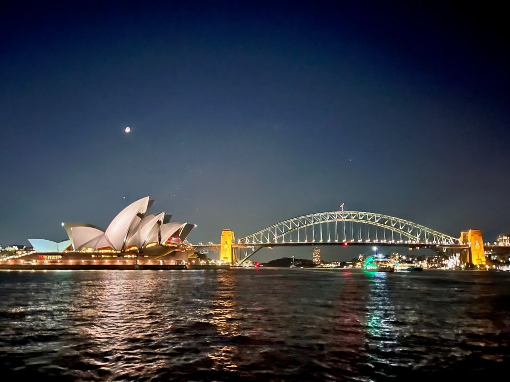 After sunset, the Coral Trekker sailed back under the Sydney Harbour Bridge and took us for a birds-eye – literally – trip past Sydney Opera House.