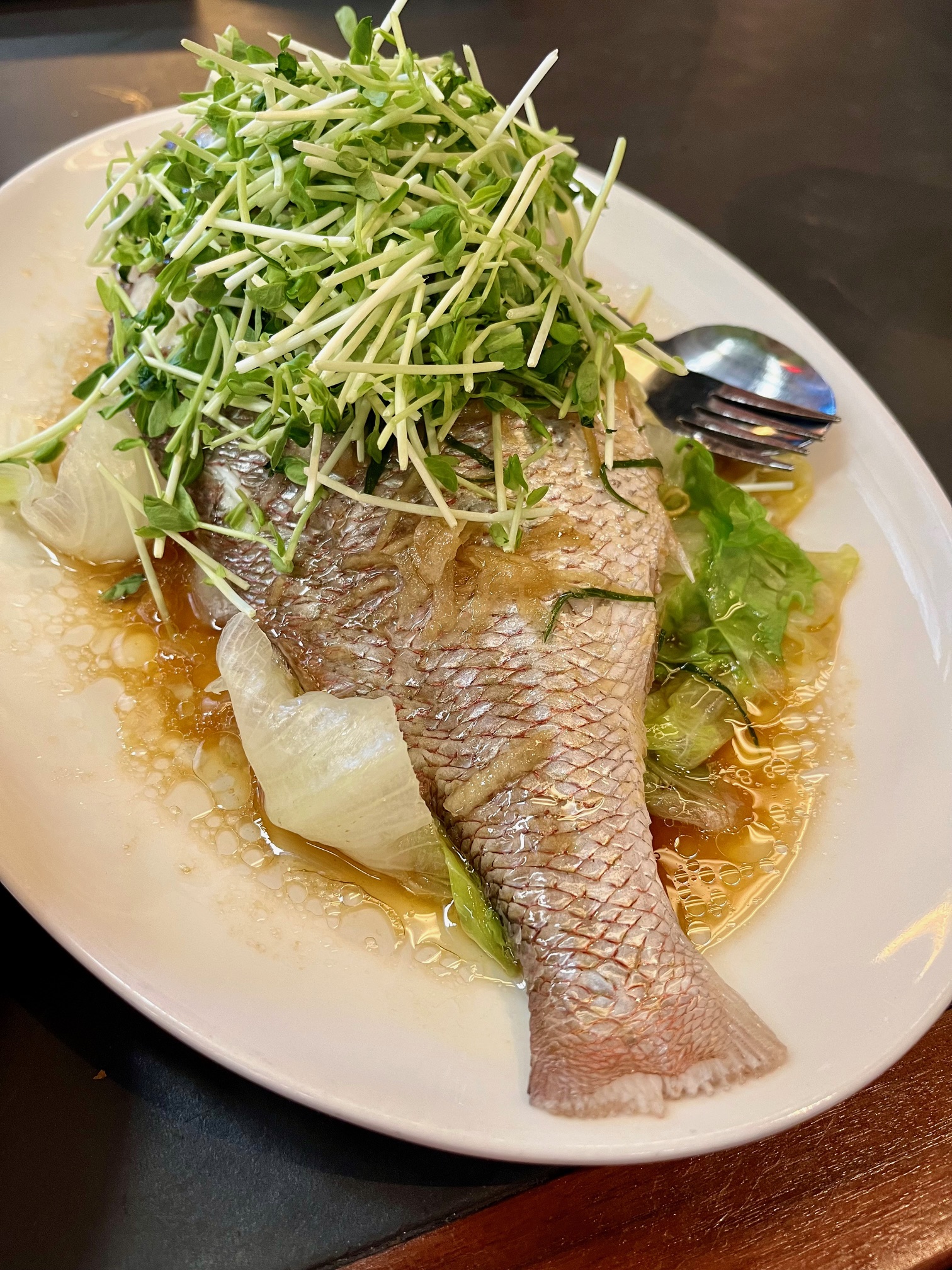 We ordered a serve of the delicious prawn toast, alongside prawn dumplings, special fried rice and whole snapper with ginger and shallots on our visit, followed by mango pudding for dessert.
