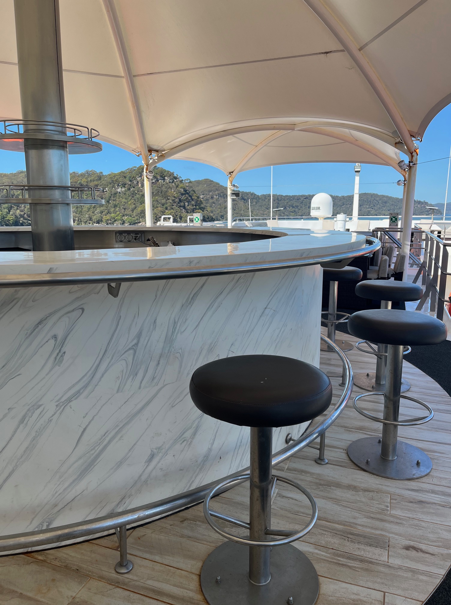 When we returned the ship we headed up to the outdoor bar on the ship’s rooftop for cocktails – the sun was warm and the views surrounding us in Promise Bay were spectacular.