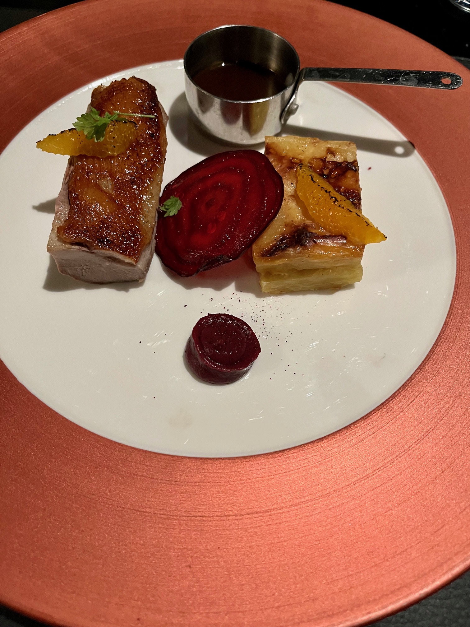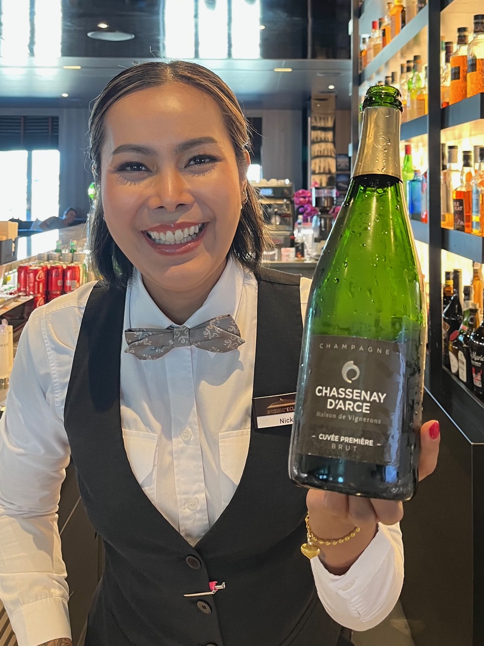 Our final night aboard was celebrated with pre-dinner bubbles at Lumiere’s Champagne Bar, followed by a seven-course degustation dinner in the adjacent French restaurant, accompanied by fabulous Chateau Neuf de Pape wine served by our knowledgeable sommelier Alex.